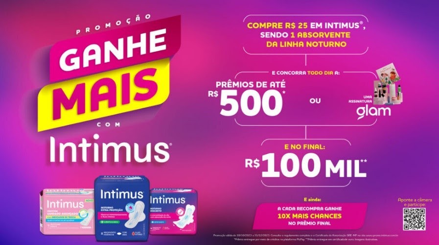 Para incentivar a experimentação dos absorventes da linha Noturno,Intimus, marca de cuidados femininos da Kimberly-Clark, apresenta a promoção “Ganhe Mais com Intimus”. As consumidoras poderão ganhar prêmios diários de até R$ 500,00 ou uma assinatura Glambox e, ao final da promoção, que termina dia 31 de dezembro, um prêmio de R$ 100 mil.