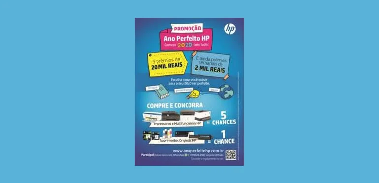 A HP lança hoje a promoção “Ano Perfeito HP”, que sorteará mais de R$ 100 mil entre os consumidores que comprarem impressoras, multifuncionais e suprimentos originais em lojas físicas ou online. Serão 16 sorteios semanais de R$ 2 mil até o dia 30 de abril e 5 sorteios finais de R$ 20 mil. Para participar, os clientes devem cadastrar os cupons recebidos nas compras no site anoperfeitohp.com.br ou enviar para o aplicativo de mensagens pelo telefone (11) 99320-2507. A cada compra de suprimentos (cartuchos, garrafas de tinta ou toner), o consumidor recebe um cupom para participar do sorteio. As compras de impressoras e multifuncionais dão direito a cinco cupons.
