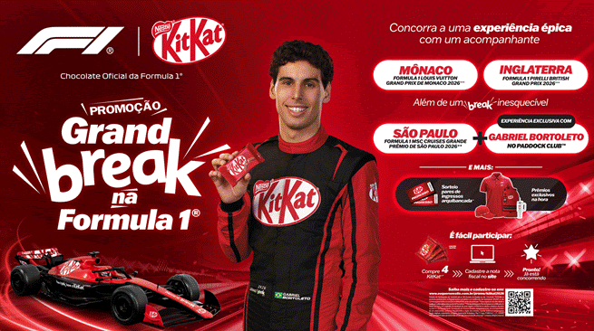 Para Nathaly Glashan, head de marketing da KitKat, a estratégia eleva o patamar da marca no território do automobilismo. “KitKat reforça sua presença na Fórmula 1 em 2026 com o lançamento da promoção ‘Grand Break’, elevando o nível da experiência ao levar consumidores para dentro de alguns dos Grandes Prêmios mais icônicos da temporada. O movimento acompanha a nova fase de Gabriel Bortoleto, refletindo também a evolução da marca ao oferecer prêmios ainda mais aspiracionais. Como chocolate oficial da F1, KitKat fortalece seu território global ao inserir o conceito de ‘break’ no maior esporte de performance do mundo, conectando-se de forma relevante e leve com a Gen Z”, afirma.