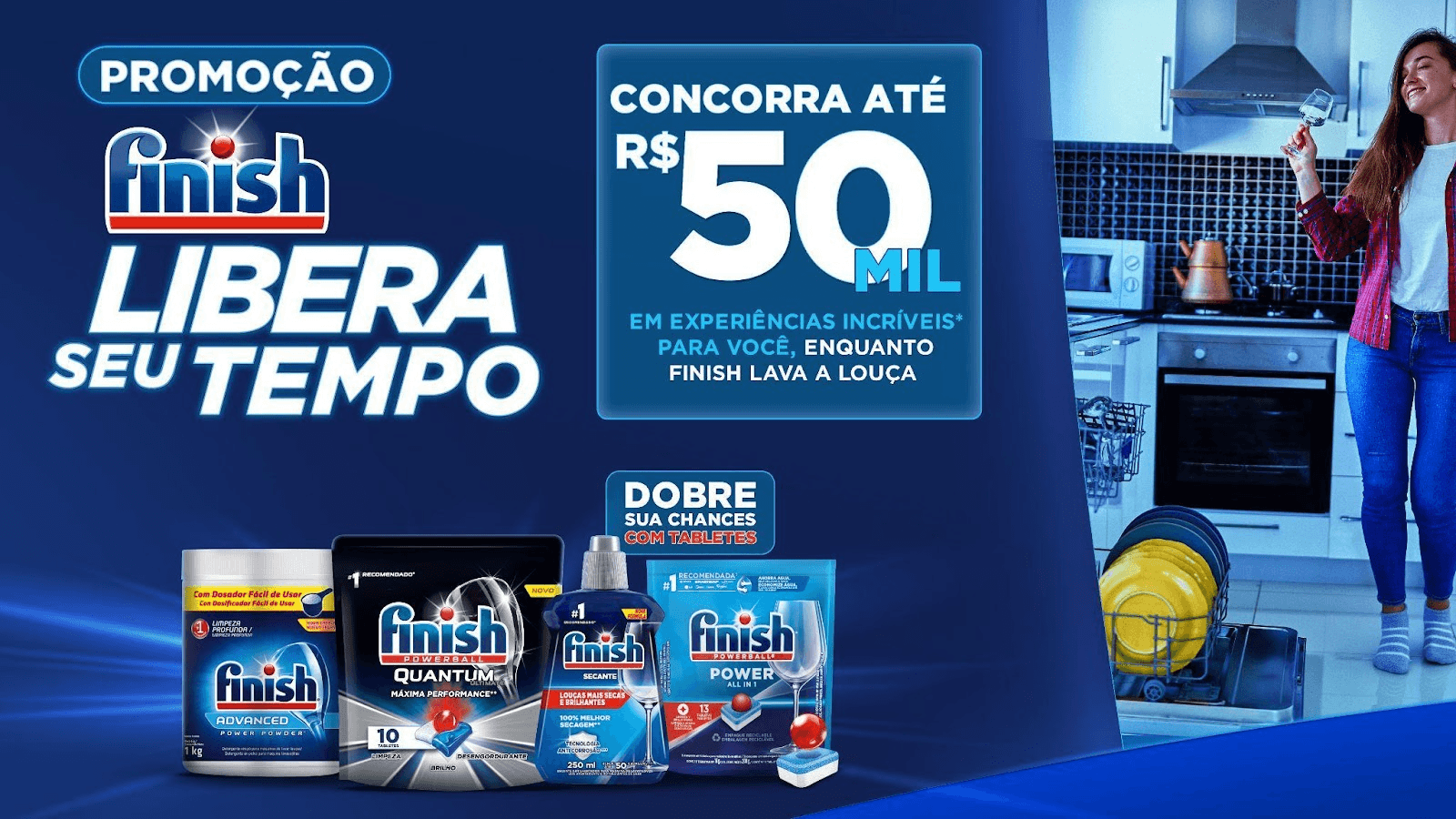 Finish, a marca de detergentes para máquinas de lavar-louças, vai sortear prêmios semanais e um prêmio final de R$ 50 mil em experiências únicas aos consumidores que adquirirem dois ou mais produtos participantes. A promoção, desenvolvida pela MKT House, tem como mote o tempo livre que se ganha ao usar produtos Finish para lavar louças na máquina.