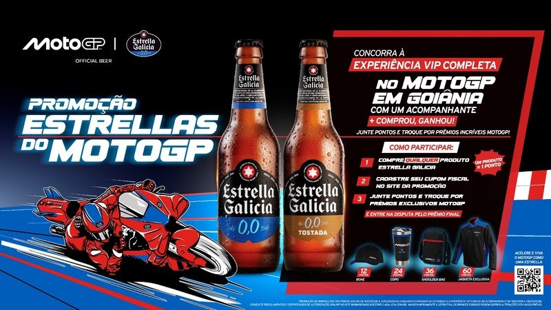 Ao longo da promoção, válida de 16 de janeiro a 27 de março, ou enquanto durarem os estoques, os participantes poderão acumular pontos e trocá-los por brindes oficiais e colecionáveis, como boné, copo térmico, shoulder bag e jaqueta exclusiva, todos personalizados com a identidade do MotoGP e da Estrella Galicia 0,0. A cada produto Estrella Galicia, o consumidor ganha um ponto e, a partir de 12 pontos, já está apto a resgatar prêmios.